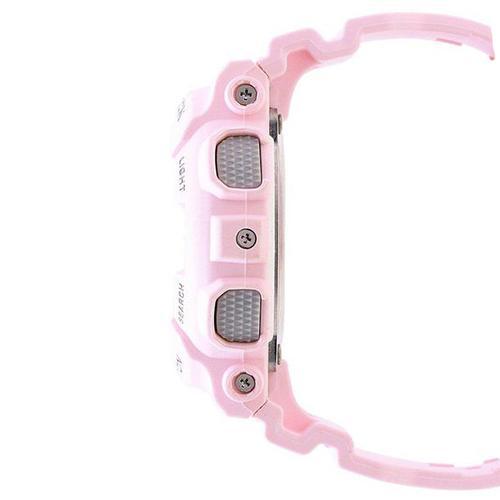 Casio G-Shock S-Series GMA-S130-4ADR is a sporty and stylish analog digital watch from popular Japanese watch maker Casio. This model comes with a fashionable light pink coloured case and band along with a similarly coloured internal round dial. It offers 200 meters water resistance and is perfect for sea/beach and swimming activities. It shows analog time, day and digital date. The watch comes with light grey time hands and pink time markers. It has 30 laps storage for data records. It is also great for active people as it has a 3-axis accelerometer built-in with a step count and reminder.