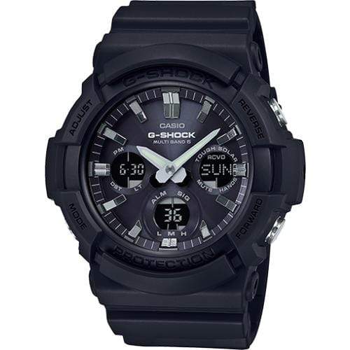 Casio G-Shock Watch GAW-100B-1A is a tough solar watch that comes with a stainless steel case. The watch features a large analog dial with grey time hands and three small digital dials. This cool wearable is Shock Resistant for protection against impact, vibration and 200 meter water resistant making it ideal for free diving. It also offers a double LED light to view time easily in any condition.